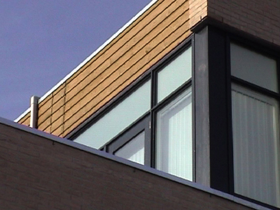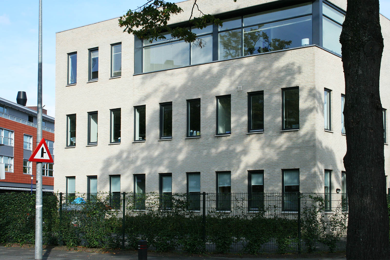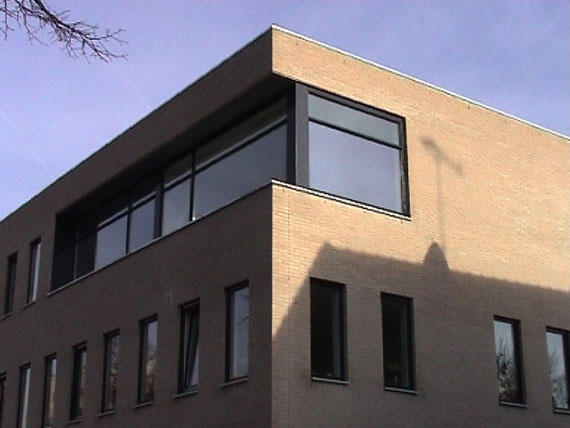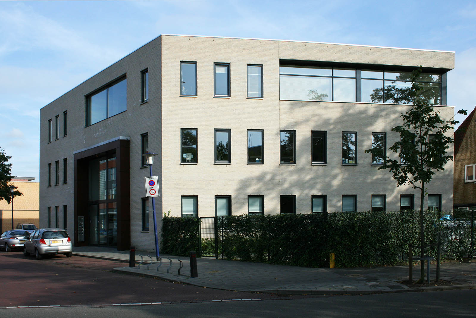 Het gebouw is als een massa op de hoek geplaatst. Een grote poort markeert de entree en de uitsnijding in de zijgevel pakt de maat en richting van de bestaande bebouwing op. Aan de tuinzijde is op de 2e verdieping een terras gemaakt en springt de bebouwing terug om licht en ruimte in het achtergebied te laten.